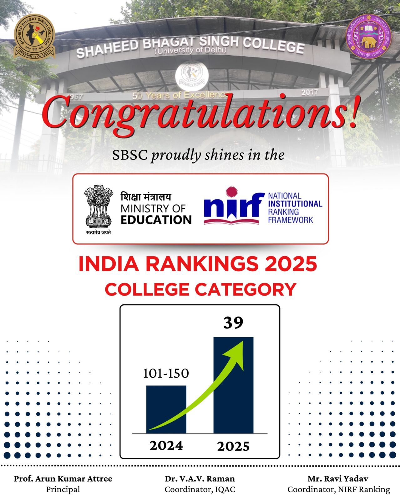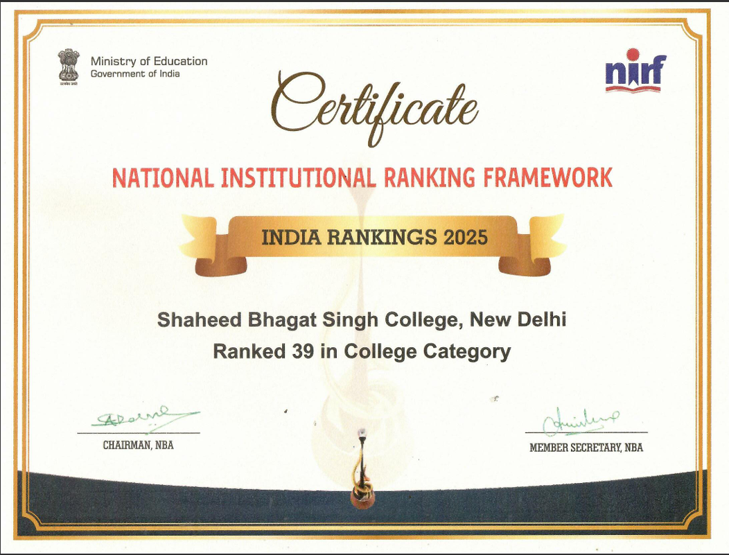 Shaheed Bhagat Singh College is ranked 39th in the All-India Rankings under the National Institutional Ranking Framework (NIRF) 2025.